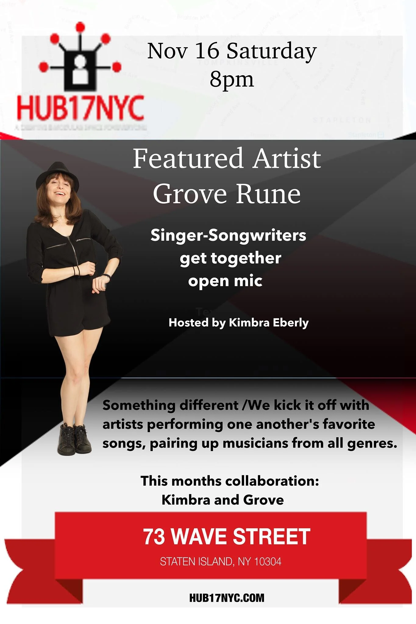 Singer-songwriter get together. Something different/ We kick it off with artists performing one another's favorite songs, pairing up musicians from all genres. This month's collaboration: Kimbra Eberly and Grove Rune. Additional guests will perform and of course an open mic night. suggested $5.00 donation