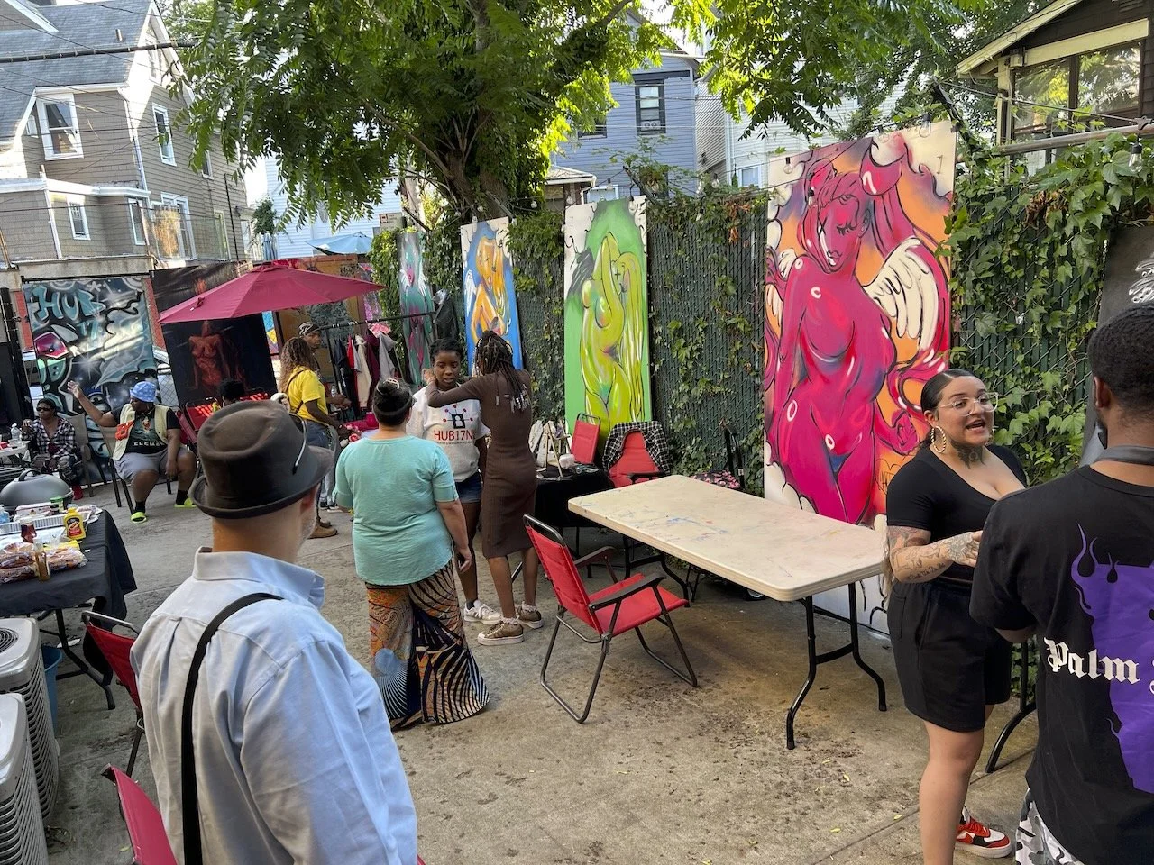 A lively outdoor art event with people socializing. There are colorful murals on the fence, including a pink angel, and multiple individuals engaging in conversations. The setting is an outdoor space with tables, chairs, and a large tree providing sh