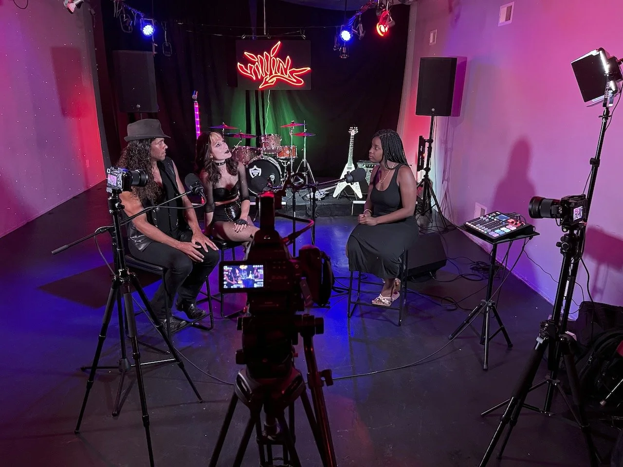 Three women sitting on chairs in a music recording studio with a drum set, guitars, and colorful stage lighting in the background, filming a conversation or interview.