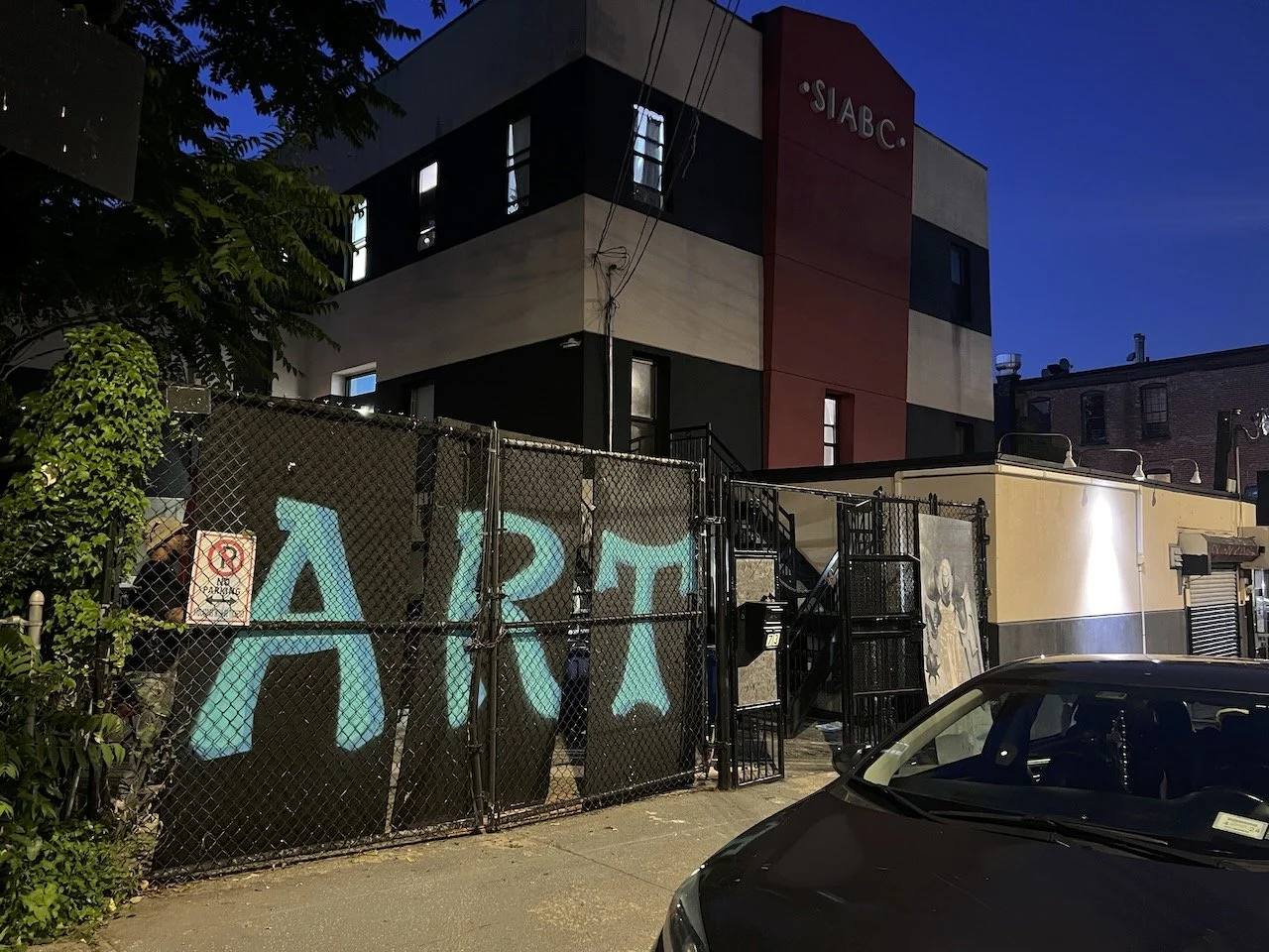 Urban scene at night showing a modern building with an SIABC sign, a fenced area with graffiti art spelling 'ART,' a parked black car in the foreground, and a man walking near the fence.