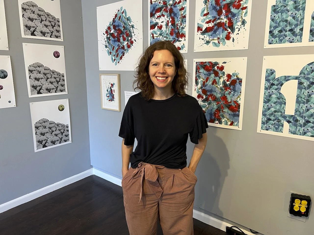 A woman with curly brown hair, wearing a black shirt and tan pants, standing in an art gallery with colorful abstract paintings on the wall behind her.