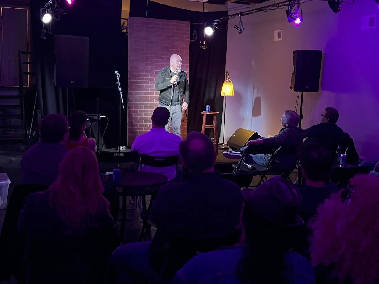 A stand-up comedian performing on a small stage with a brick wall backdrop, illuminated by purple and yellow stage lights, while an audience watches seated at small tables.