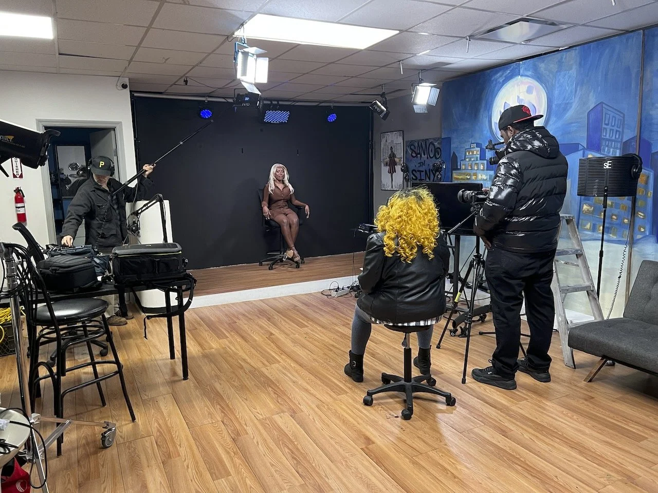 Film crew set up in a studio with a woman sitting on a chair for a video shoot, with lighting and camera equipment around her.