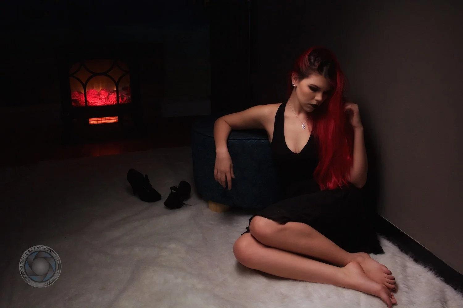 A woman with long red hair sitting on the floor next to a wall in a dimly lit room. She is wearing a black dress and jewelry. There are black shoes on the white fur rug and a fireplace in the background.