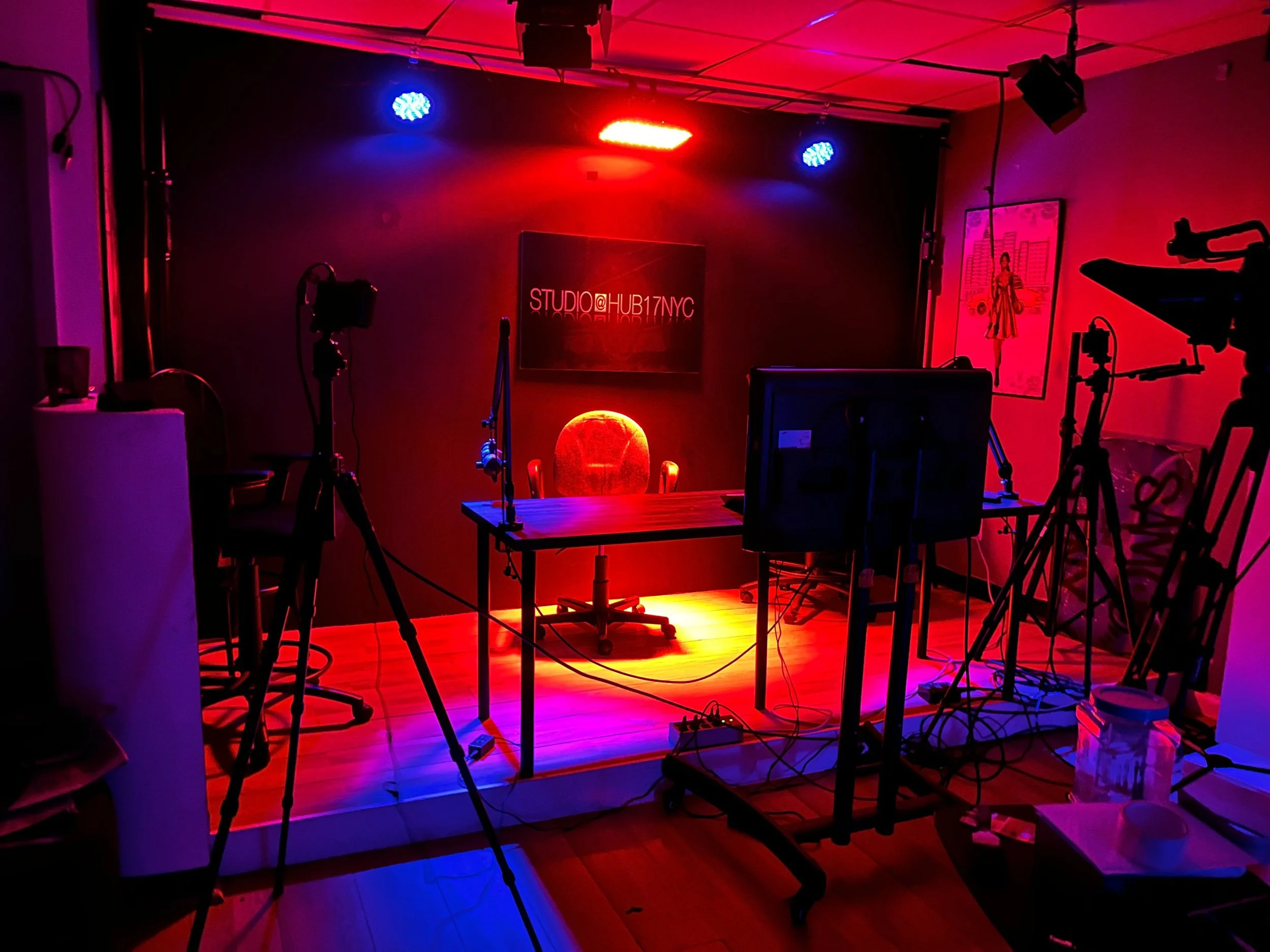 Empty video production studio with camera equipment, lighting, and a desk, illuminated by red, blue, and purple lights.