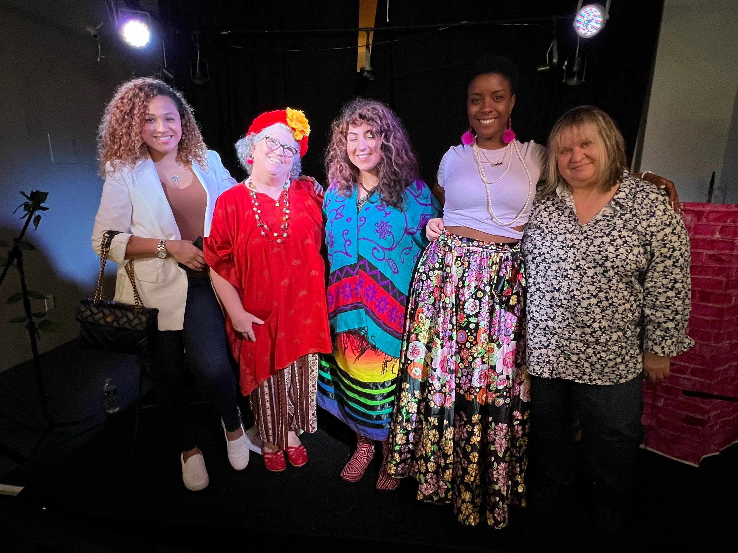 Six women standing together on a stage, smiling, dressed in colorful and eclectic outfits, with dark background and stage lights.