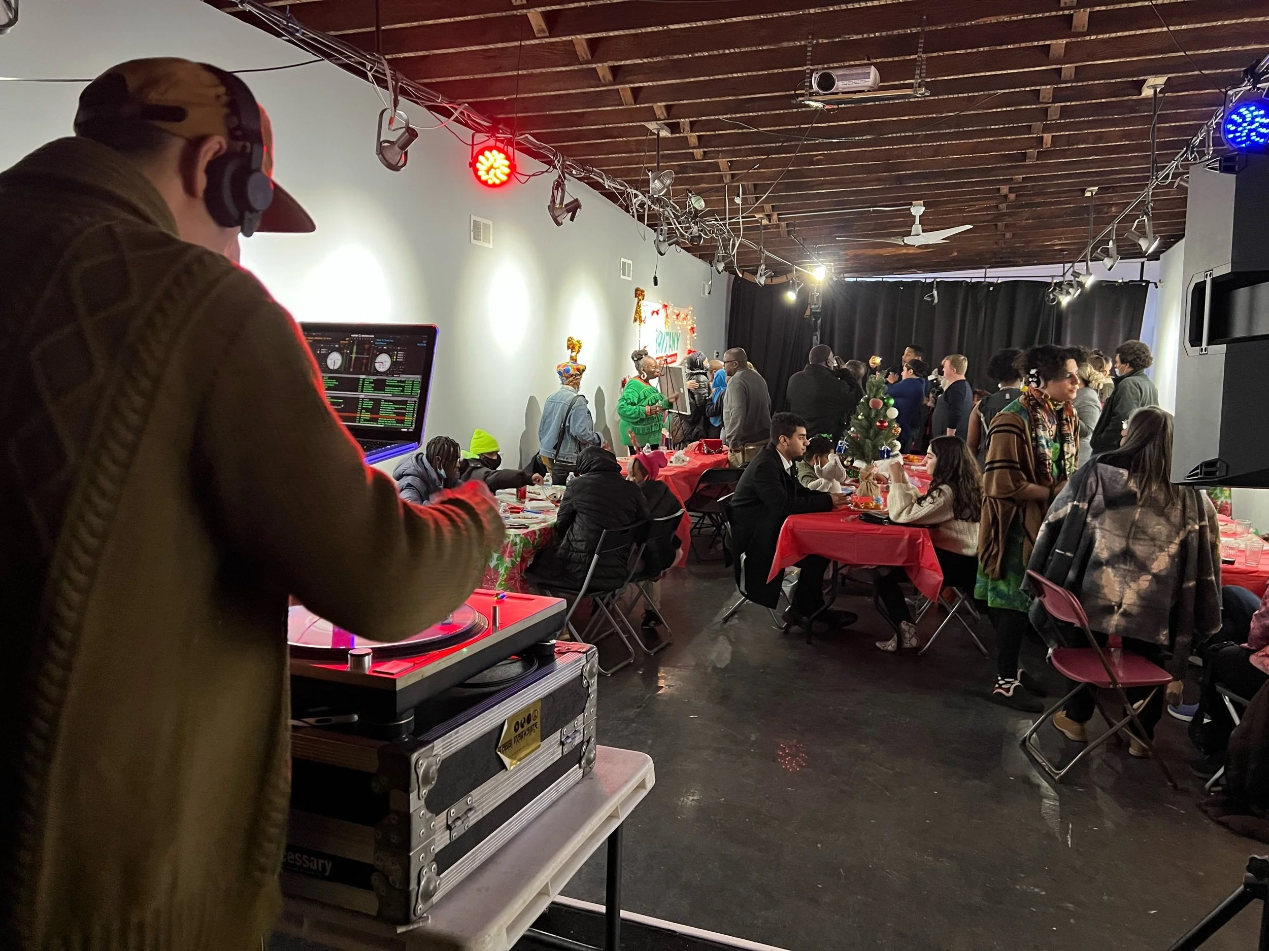 A DJ wearing headphones and a brown jacket plays music at a holiday party, with guests sitting at decorated tables and standing in a room with a Christmas tree and festive decorations.