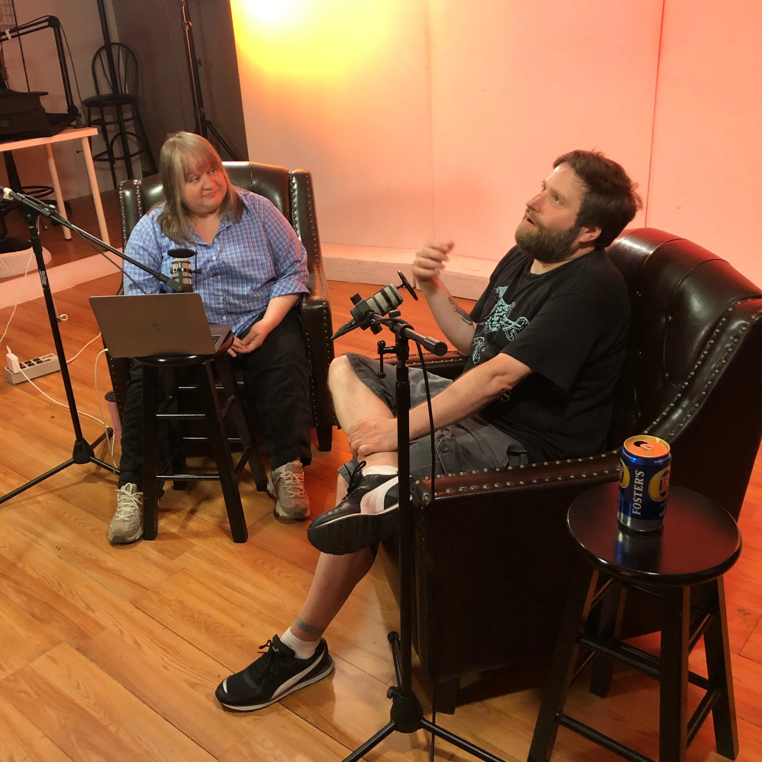 A man and woman sitting in chairs having a conversation in a recording studio. The woman is listening attentively while the man is speaking. There are microphones, a laptop, and a Foster's beer can on a small table nearby.
