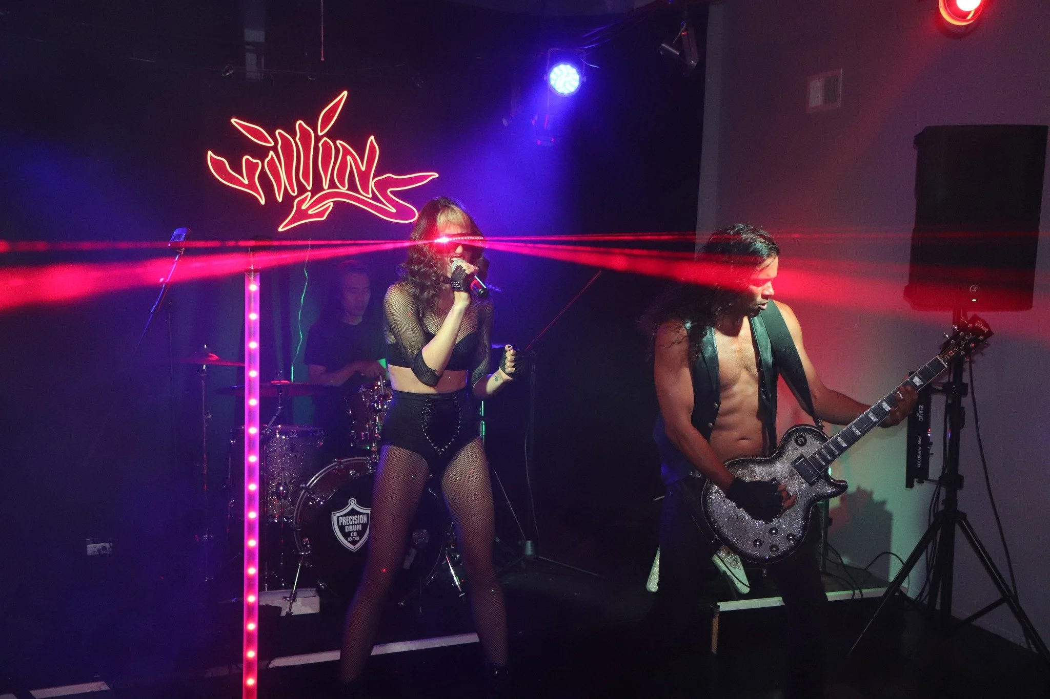 A band performing on stage with a female singer, a guitarist, and a drummer. There is a neon sign reading 'VILLAIN' in the background, and colored stage lights create light streaks across the image.