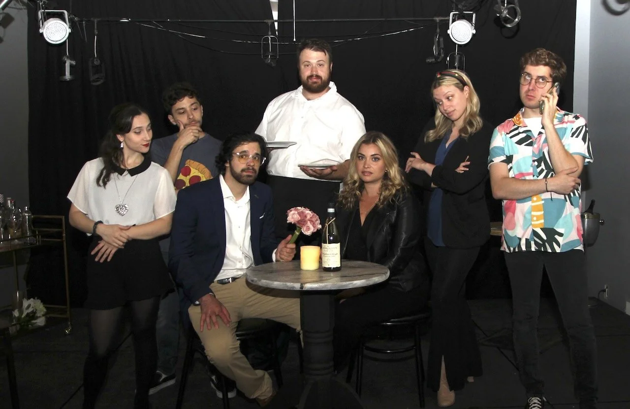 Group of seven people, with some sitting at a table and others standing behind, in a dimly lit setting that appears to be a theatrical or performance space. The table has a pink flower, a bottle of wine, and a candle. People are dressed in casual and