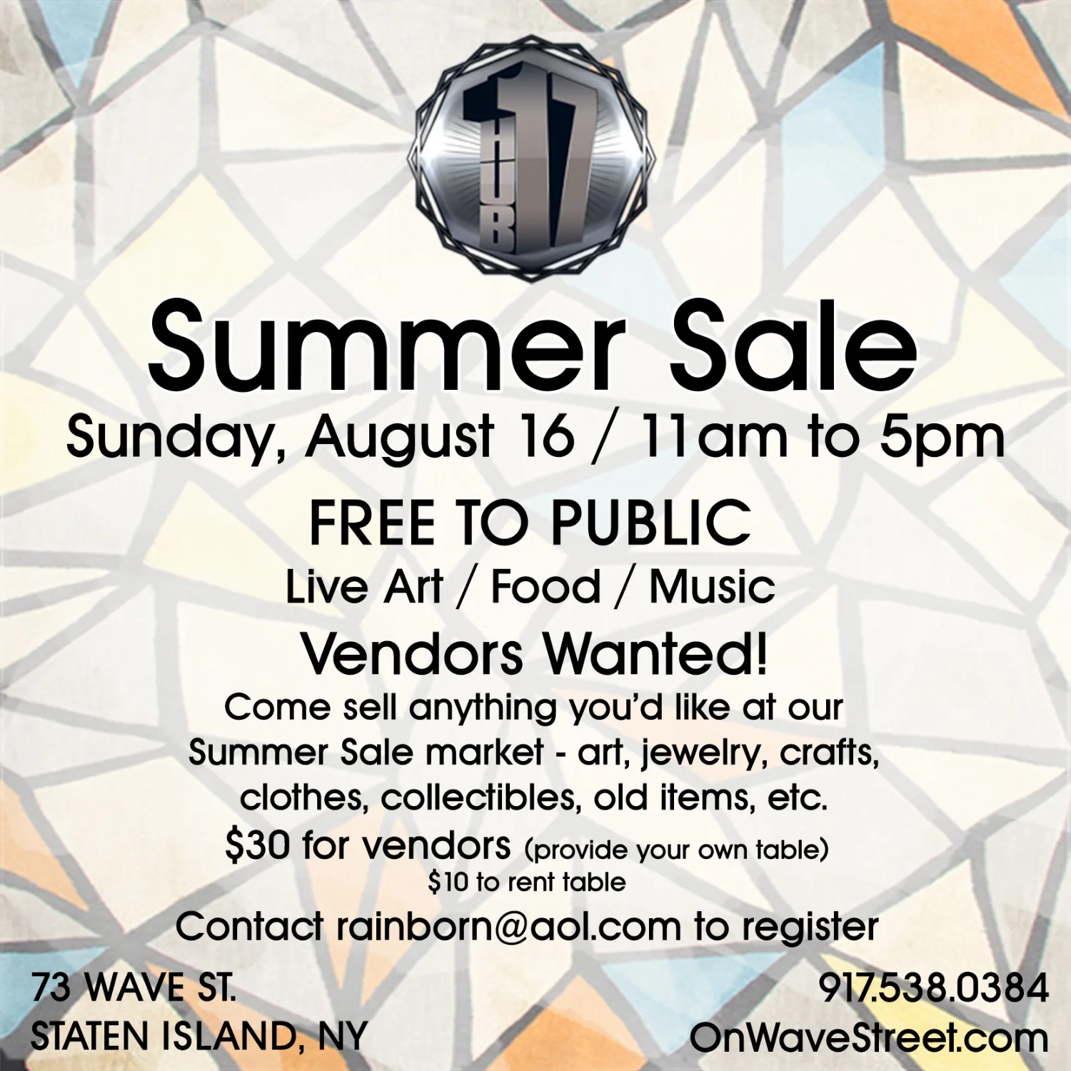 Summer Sale Sunday, August 16, 2015 11:00 AM 5:00 PM Hub 17 73 Wave St Staten Island, NY, 10304 United States (map) Google Calendar ICS Vendor Sign up