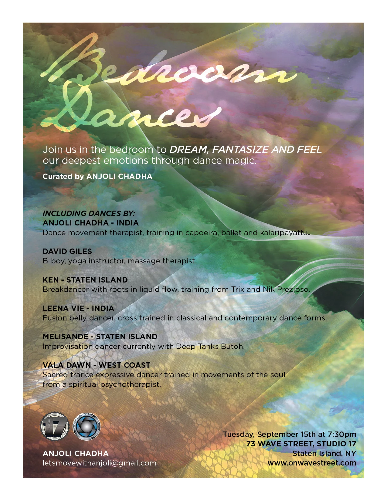Back to All Events Bedroom Dances Tuesday, September 15, 2015 7:30 PM 8:30 PM Studio 17 73 Wave St Staten Island, NY, 10304 United States (map) Google Calendar ICS