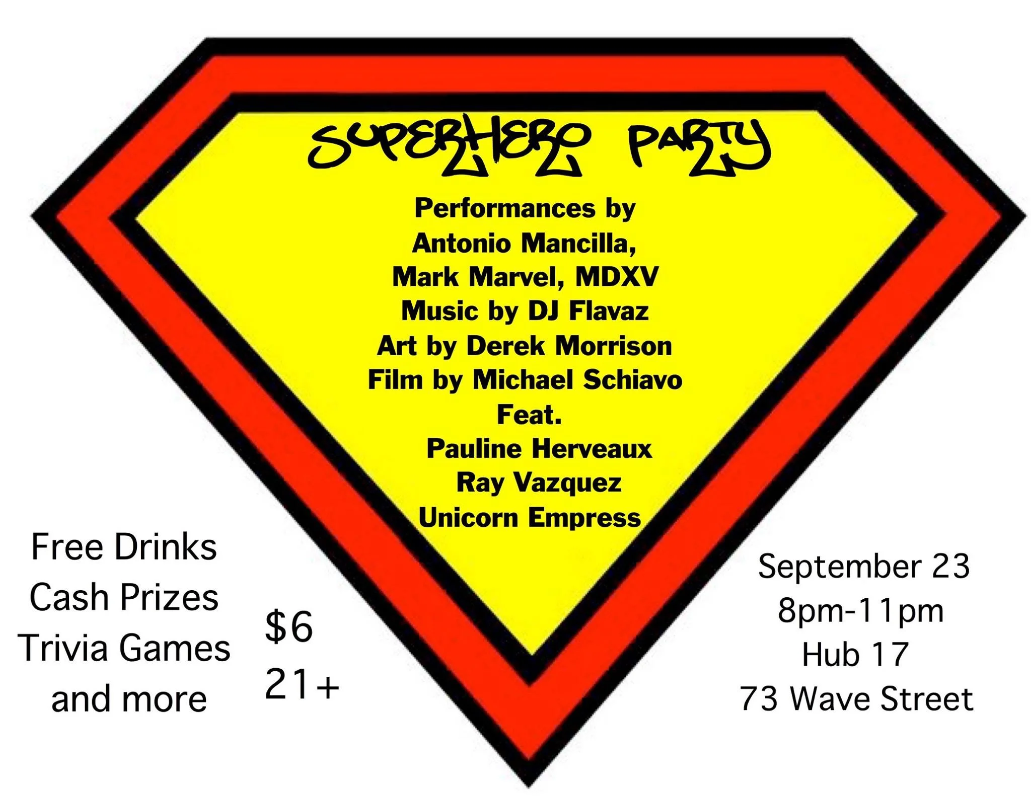Super Hero Party Wednesday, September 23, 2015 8:00 PM 11:00 PM Hub 17 73 Wave Street Staten Island, NY, 10304 United States (map) Google Calendar ICS