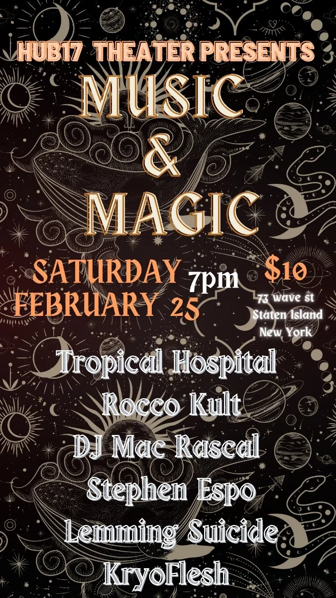 Music and Magic Saturday, February 25, 2023 7:00 PM Sunday, February 26, 2023 12:00 AM Hub 17 73 Wave St Staten Island, NY, 10304 United States (map) Google Calendar ICS