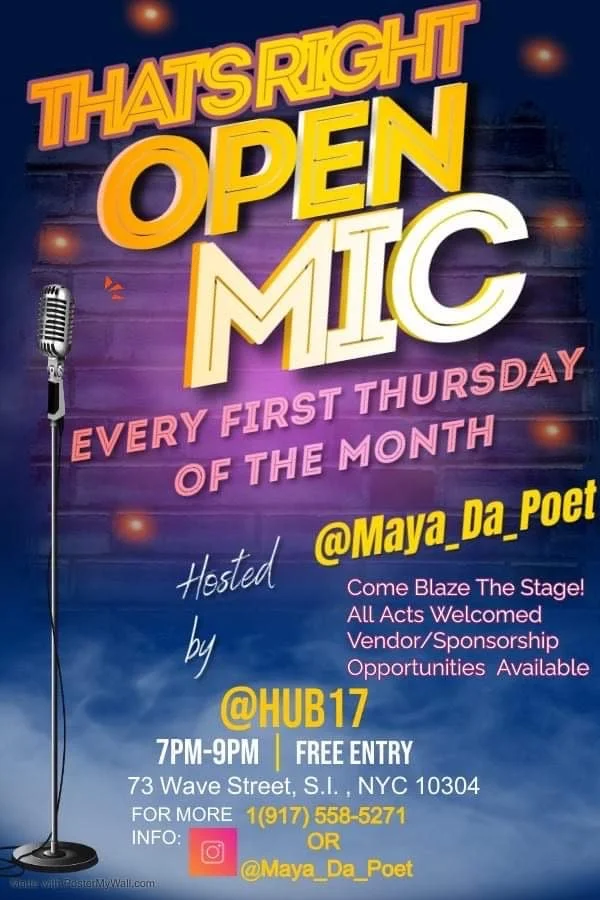 Back to All Events That's Right Open mic Thursday, April 6, 2023 7:00 PM 9:00 PM Hub 17 73 Wave St Staten Island, NY, 10304 United States (map) Google Calendar ICS