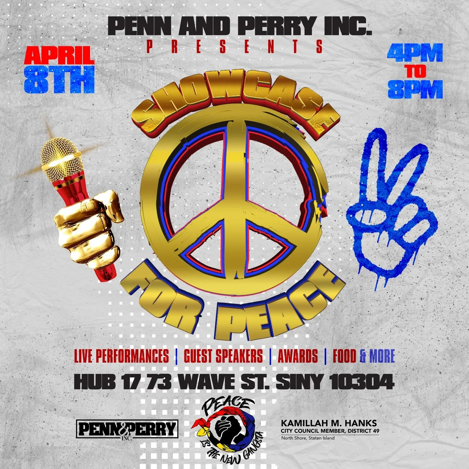 Back to All Events Showcase for Peace Saturday, April 8, 2023 4:00 PM 8:00 PM Hub 17 73 Wave St Staten Island, NY, 10304 United States (map) Google Calendar ICS