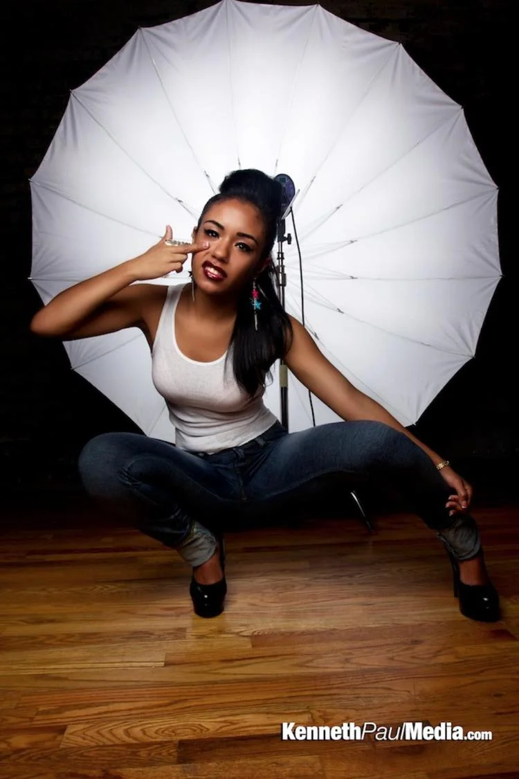 Woman in white tank top and jeans squatting on wooden floor with a white umbrella in the background, making a gesture near her face, in a studio setting.
