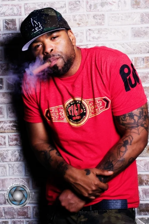 Methodman wearing a camouflage Los Angeles Dodgers cap and a red shirt with tattoos on his arm, holding up his sleeve to reveal an arm tattoo, while smoking a cigar and standing in front of a brick wall.