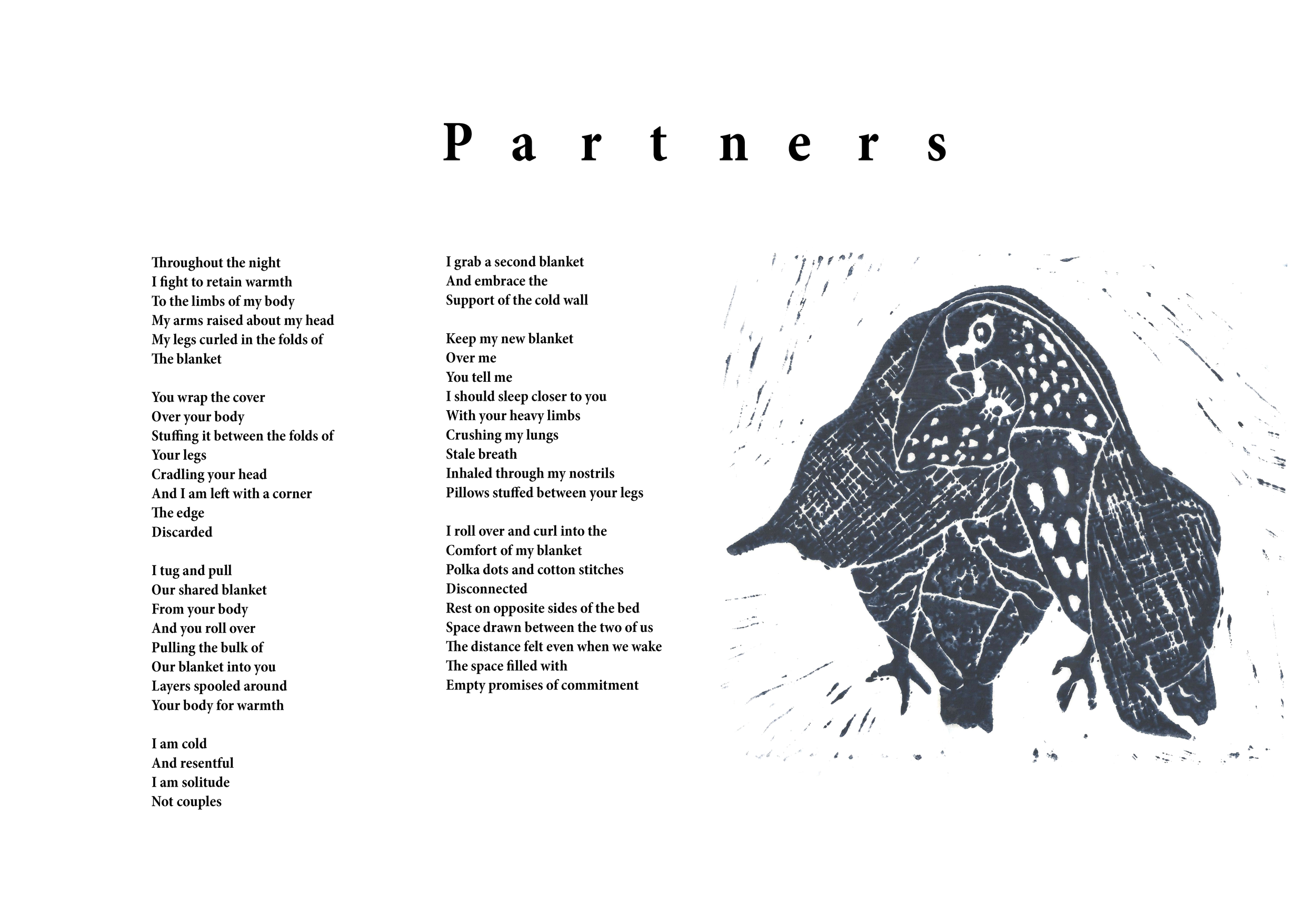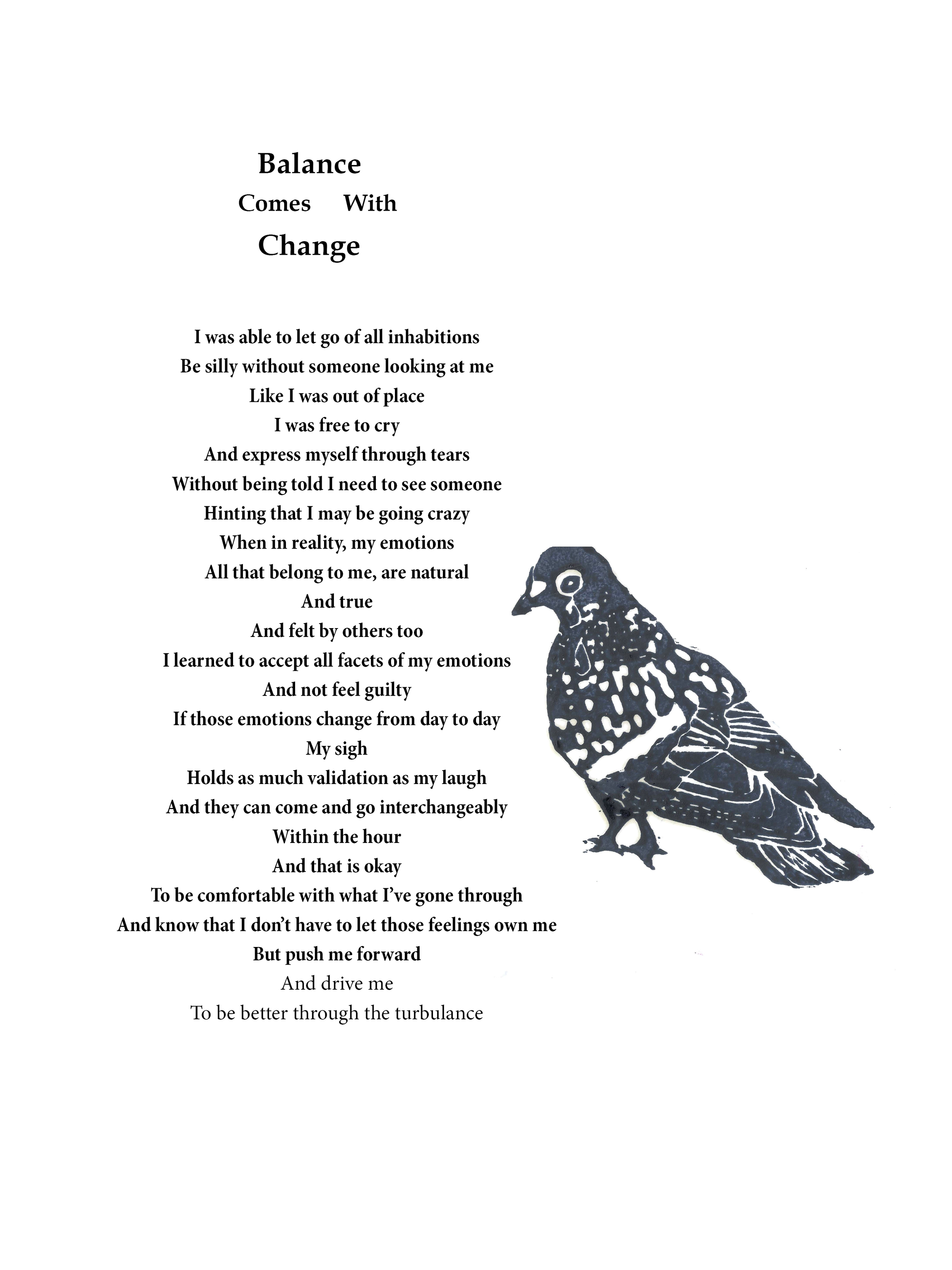 I wanted to tackle tough topics of discussion, using simple means of visualization. For this reason, I chose linoleum prints for its simplicity of design using negative space. I used pigeons, a common bird to New York City to depict complex ideas using mundane visualizations. I use the pigeon because I could adapt its body to different scenarios without being vulgar or offensive when engaging with the audience. My poetry deals with topics that can sometimes be viewed as activist poetry and deals with topics focusing on controversial topics. For this reason, my goal was that the images I paired with the poems, will encourage people to explore the writing more in depth in a way that makes them feel more comfortable and at the same time showcase what is being spoken about openly - whether it be about struggles of Black lives or motherhood and so forth.