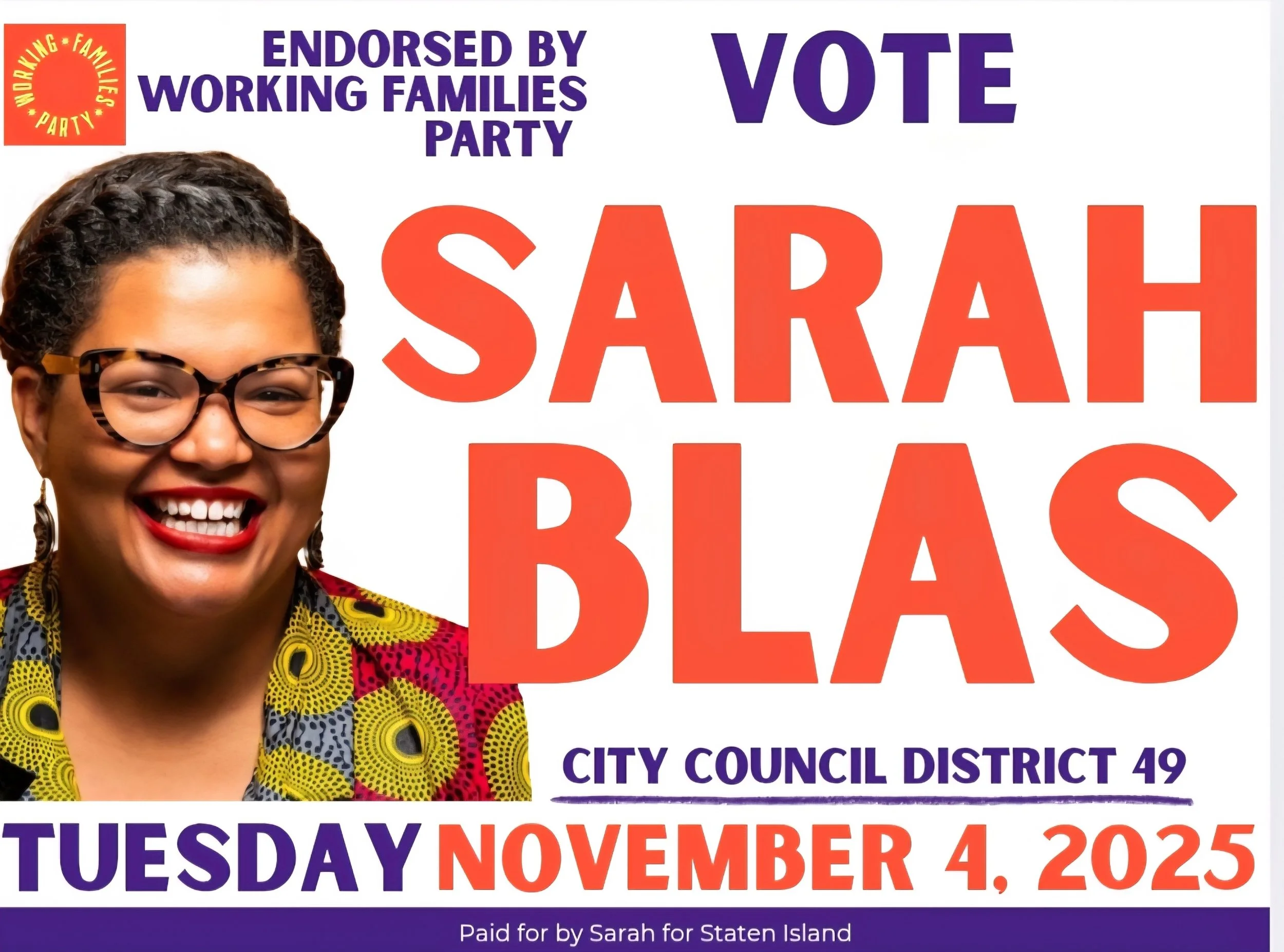 A campaign poster featuring Sarah Blás, endorsed by Working Families Party, for city council district 49, scheduled for Tuesday, November 4, 2025. The poster includes a smiling woman with glasses, wearing a colorful patterned top, and contains campaign details and voting information.